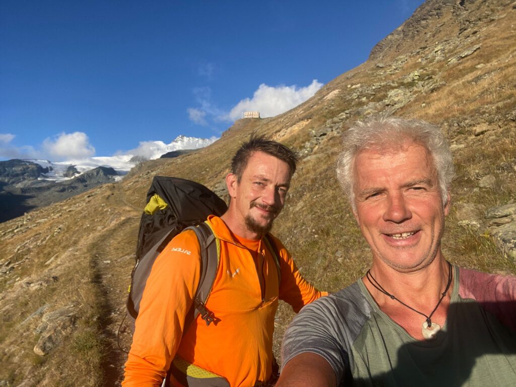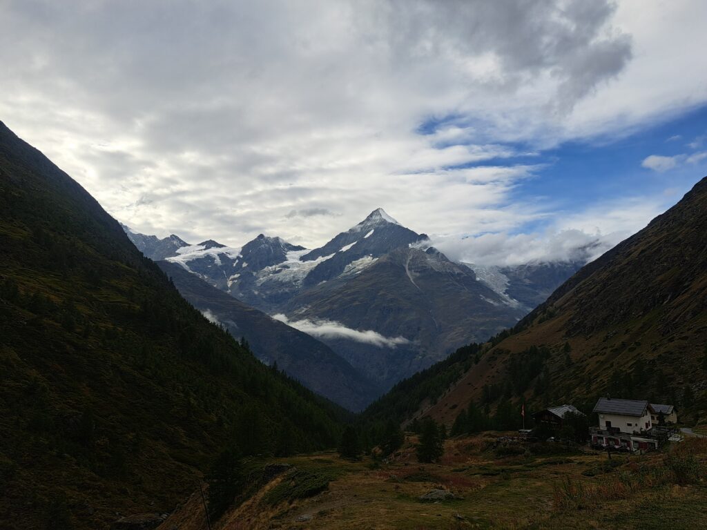 On Monday, we drove towards Switzerland. Unfortunately, the weather forecast for the coming days was downright bad. As soon as we entered the Alpine region, it started raining. The weather is often worse on the north side than on the south side, but unfortunately, that wasn’t the case either. Nevertheless, we drove towards Täschalp to walk to the Täschhütte from there. We parked the car and saw that the weather was starting to clear up a bit. Would it all turn out alright after all? We began our hike to the hut, and the sun was shining ever more intensely. We had a beautiful view of the Weisshorn across the valley and quickly took off a layer of clothing. When the sun is shining, you could really feel it. After about 50 minutes, we arrived at the hut at an altitude of 2701 meters. We checked in and could immediately start preparing dinner. After filling our bellies, we ask the hut lady about the weather forecast for tomorrow. What she tells us isn’t what we’d hoped for: cloudy and rainy all day. With these conditions, the intended destination is definitely a no-go. Perhaps we can still climb the Alphubel.