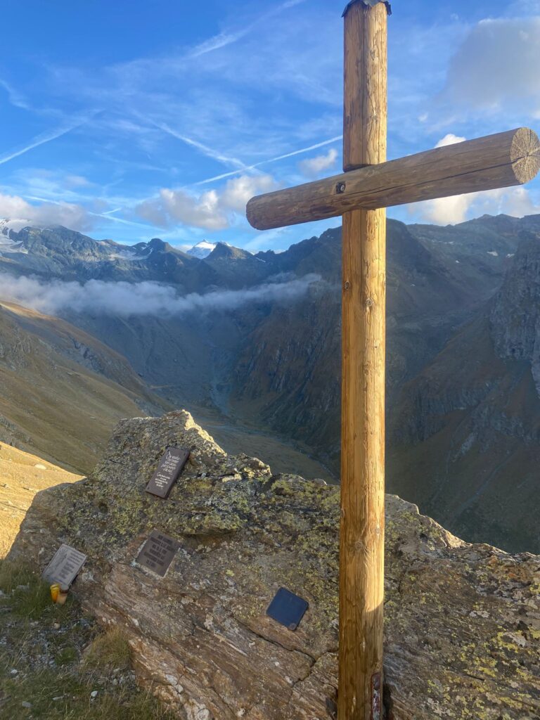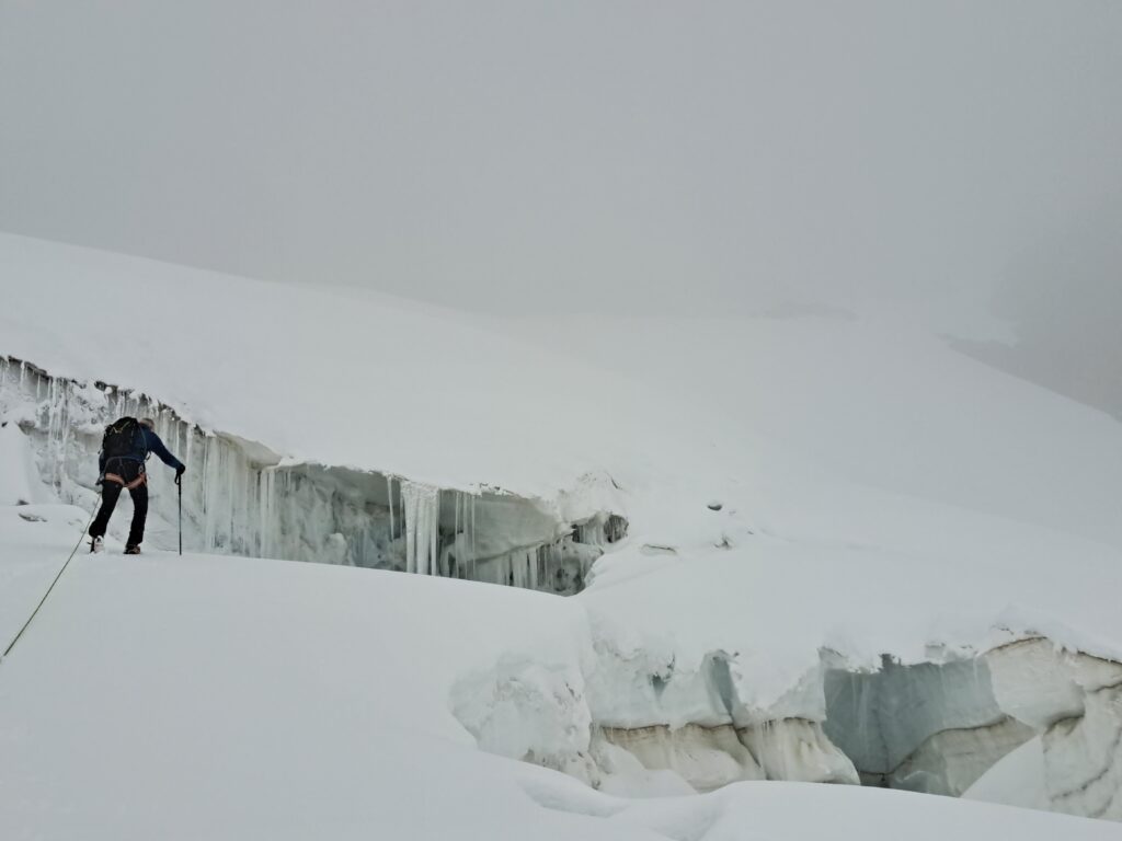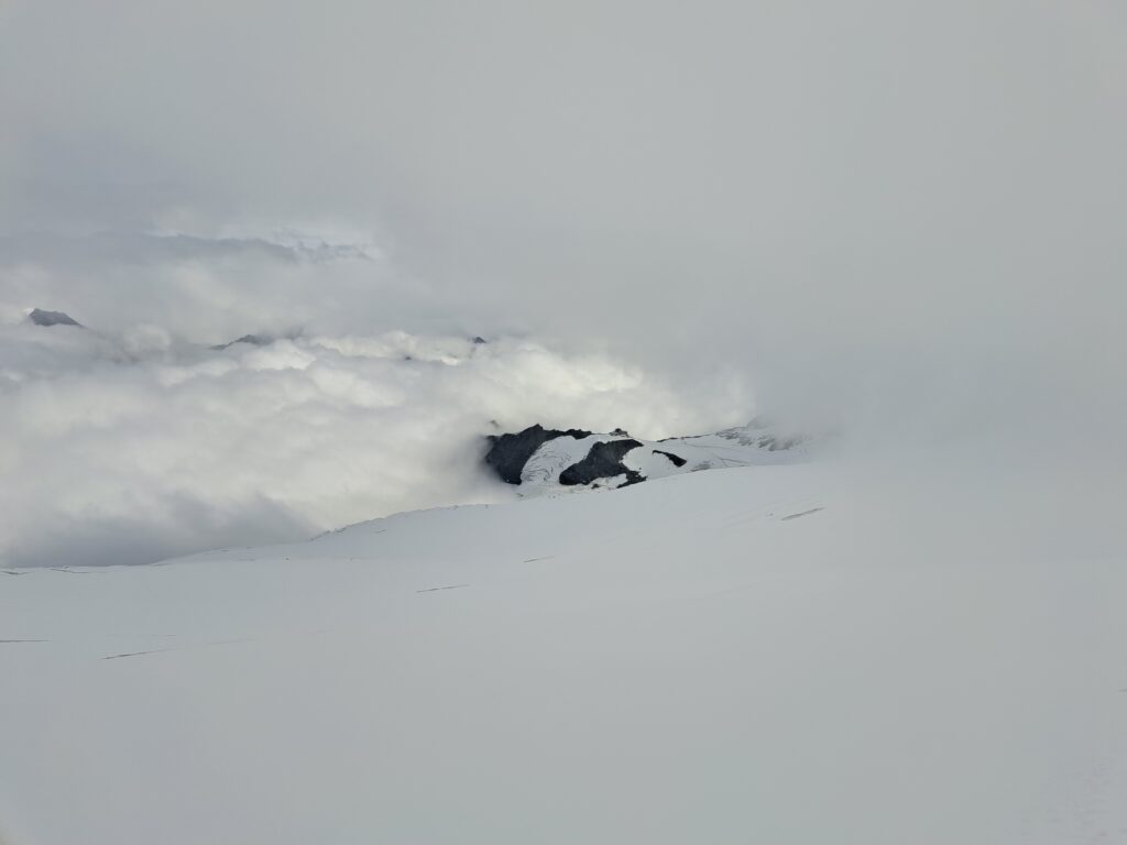 The alarm goes off and we wake up after a wonderful night. It’s certainly not a punishment to get up in the morning instead of in the middle of the night. We go downstairs and eat breakfast. The weather doesn’t look good, and we decide to wait until it improves. Around 9:30, it finally dries up a bit, and we decide to give it a try. We leave the hut and head towards the mountain where the route begins. After about 50 minutes, we arrive at the first glacier. We decide to take the moraine on the right instead of going over the glacier. After all, we’ll encounter plenty of snow and ice in the coming hours. But a little later, we can’t avoid it. We have to cross the glacier to reach a rock formation where the next ice mass awaits us. There’s not much left of the glacier, so we leave the rope in our backpacks for a while. It’s not a steep section, and we soon reach the rocks. After this, the ice slope becomes much steeper, but after another brief discussion, we decide not to rope up yet. There’s little fresh snow, so we can see the crevasses. Here too, things move quite quickly, but the clouds are thickening, and our visibility is decreasing. Slowly but surely, we get closer to the Alphubeljoch at 3,772 meters.