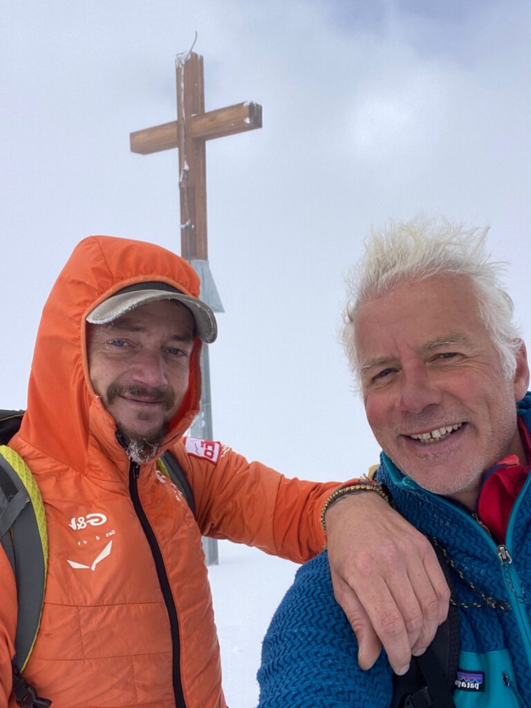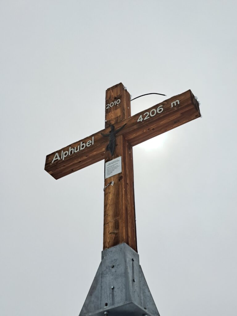 Further on, we see a large crevasse and safety comes first. Wilco easily traverses the crevasses and then we reach the summit ridge. Here, we first scramble over a rock formation before finally reaching the Eisnase. Of course, it’s completely out of shape; there’s no patch of fresh snow, just ice. That makes the climb a bit different. Wilco climbs the first section and decides to use an ice auger just in case. I’ve brought my technical crampons, and they’re a bit easier to climb in steeper ice than Wilco’s regular crampons. After the Eisnase, we arrive at the kilometer-wide snow plateau of the summit. Wilco starts filming and shouts: “We’ve got him!” But unfortunately, I had to tell him we still have a few meters to climb towards the summit cross, which is not yet visible. We laugh and continue along the now wide ridge. Because of the dense fog, it’s so difficult to see where we’re putting our feet that we occasionally misstep and end up next to the ridge. Oh well, falling off the Alphubel would be an achievement, so we continue on the last few meters with renewed vigor. And then the summit cross finally appears out of the mist. Phew, we’ve made it!